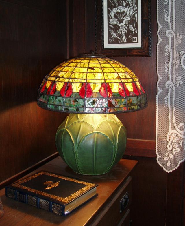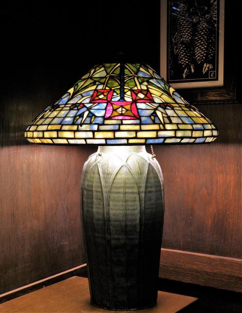 The creation of each Art Glass Lamp is a series of complex tasks, beginning with the initial design created by Marlin Rotach and ending with the superb craftsmanship of Chris Bennett. All lamps are unique one-of-a-kind works of art. They are crafted with only the finest rare art glasses and electrical components. The glass shades interact with both reflected and transmitted light in a multitude of ways, creating an everchanging visual experience to be enjoyed for generations to come. The bases are vintage antiques or ceramic creations of Jemerick Art Pottery. Due to the complexity of design and perfection of craftsmanship, only one lamp is completed yearly. Price on Request